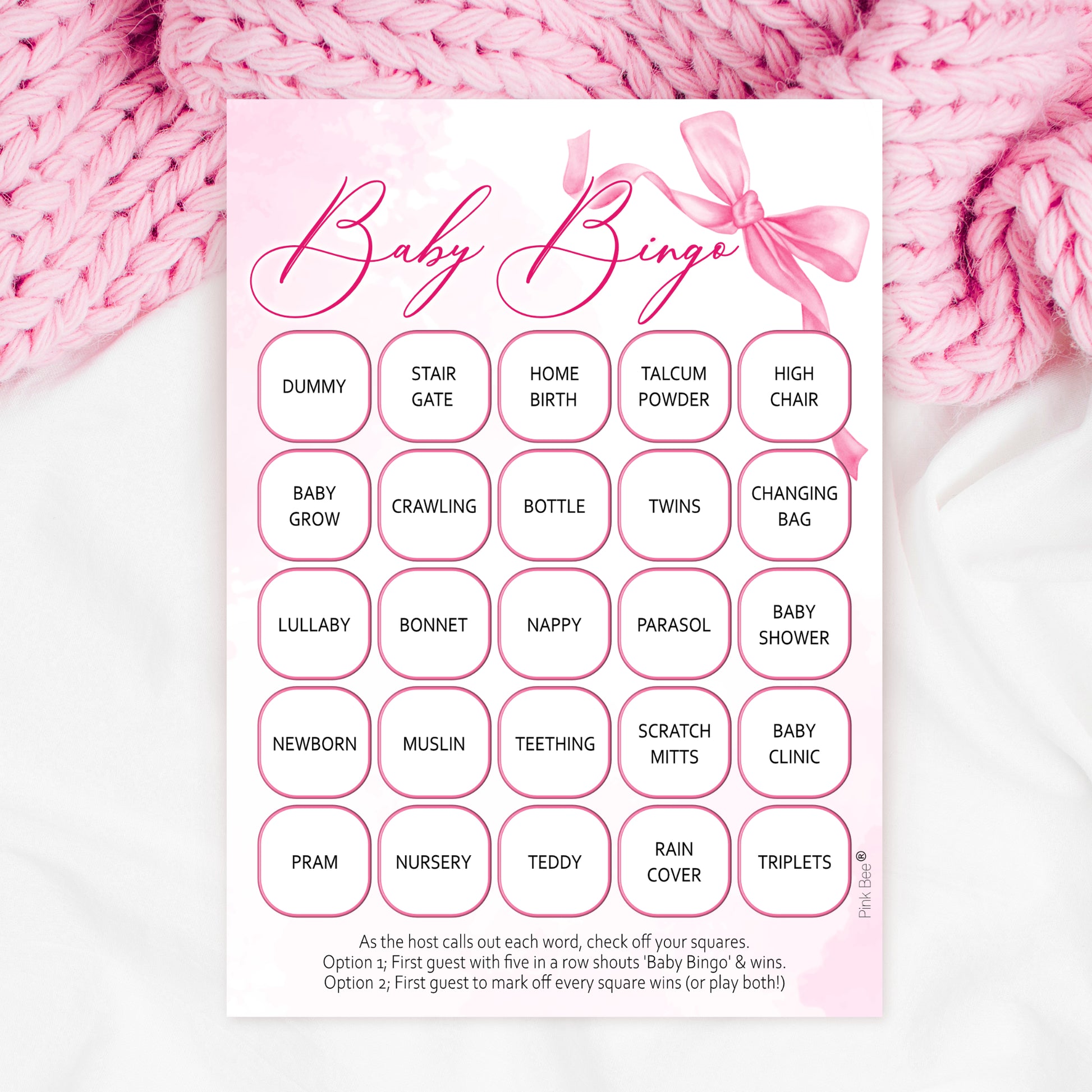 Introducing our Baby Bingo Game from the luxurious Pretty Pink Bow theme. Delicate pink hues and a pretty ribbon bow adorn this minimalist design to add a touch of elegance to your celebration.